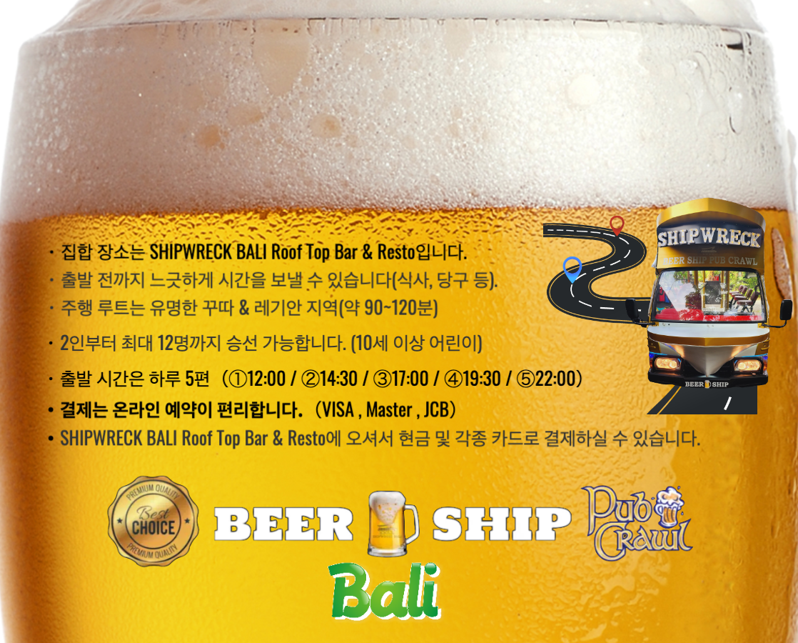 꾸따, 레기안 지역의 유명한 꾸따 해변을 따라 해변 산책 쇼핑몰을 지나 가장 번화한 레기안 거리를 지나게 됩니다.많은 관광객들이 오가는 가운데 한 단계 높은 차 안에서 주변을 둘러보며 최고의 음악과 무제한 음료를 즐길 수 있습니다.약 90~120분간의 BEER SHIP PUB CRAWL을 마음껏 즐겨보세요.