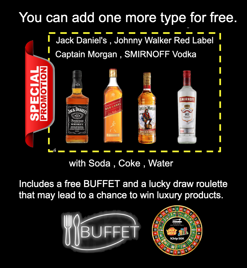 | На выбор одна бутылка любимого напитка (Jack Daniels, Johnnie Walker Red Label, Captain Morgan, Smirnoff Vodka). Газированная вода, кола или минеральная вода включены в стоимость. |